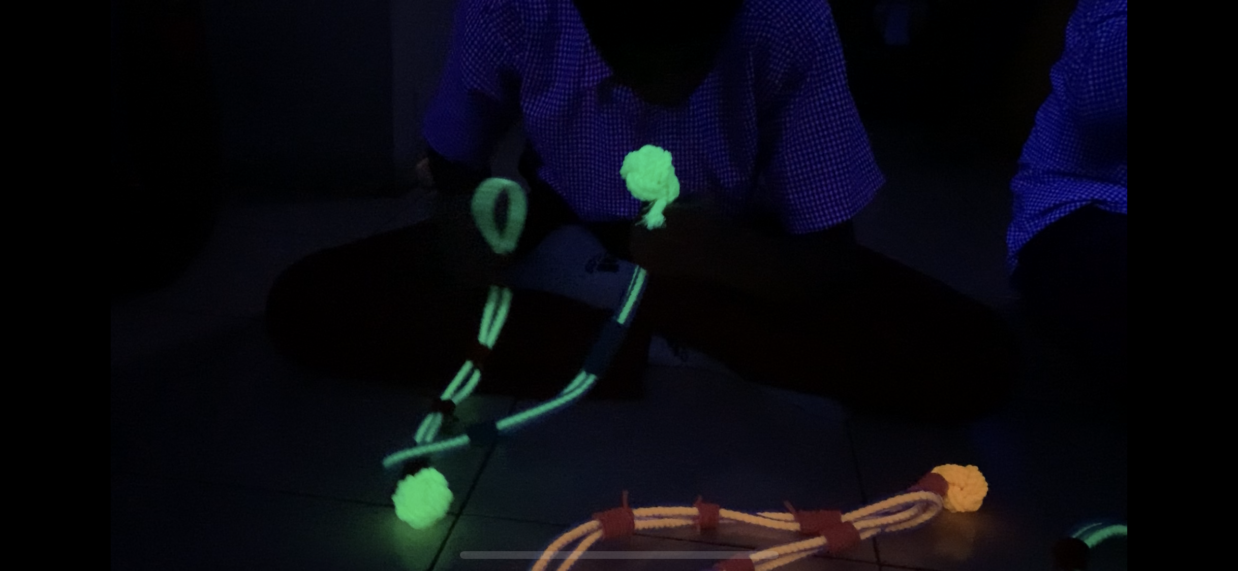 Loopers were made using a neon nylon cord inside a plastic cord for them to shine in the UV room. These rooms were a part of the facility as it helps inform the educators of the vision of the child, if the child is able to see the glowing object in the room.